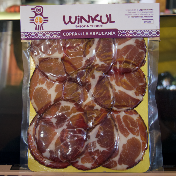 Inspirada en la Coppa italiana y fusionada con el espíritu de La Araucanía Andina. Usamos la Capicola del cerdo criado sin hormonas o promotores de crecimiento, ahumamos con especies nativas y maduramos con cobertura de Merkén. Una fina cecina cruda de exquisita textura, color y sabor, ideal para acompañar vinos y quesos, así como para sofisticados bocaditos y tapas.